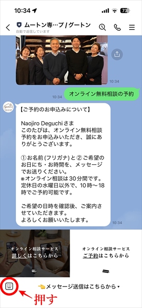 ②LINEのトーク画面を開き、「ご予約はこちらから」をタップ