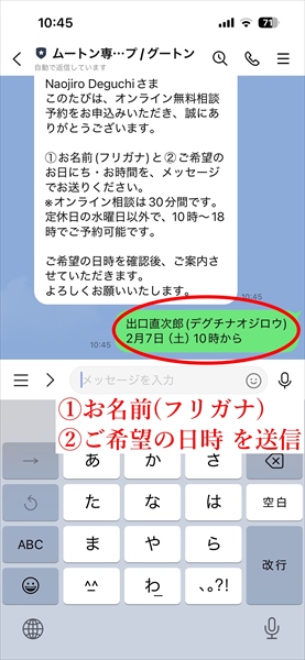 すぐに自動返信メッセージが届きますので、①お名前(フリガナ) ②ご希望のお日にち・お時間 をメッセージでご連絡ください。