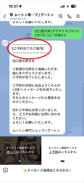 お日にち・お時間を確認後、予約が完了すれば店舗からメッセージが届きます。