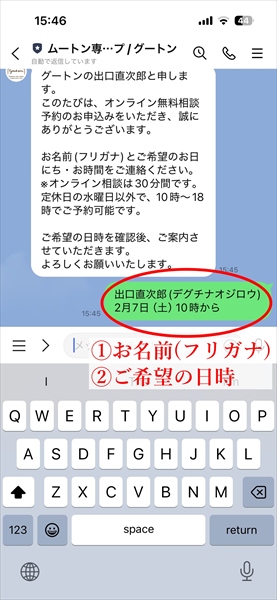 すぐに自動返信メッセージが届きますので、①お名前(フリガナ) ②ご希望のお日にち・お時間 をメッセージでご連絡ください。